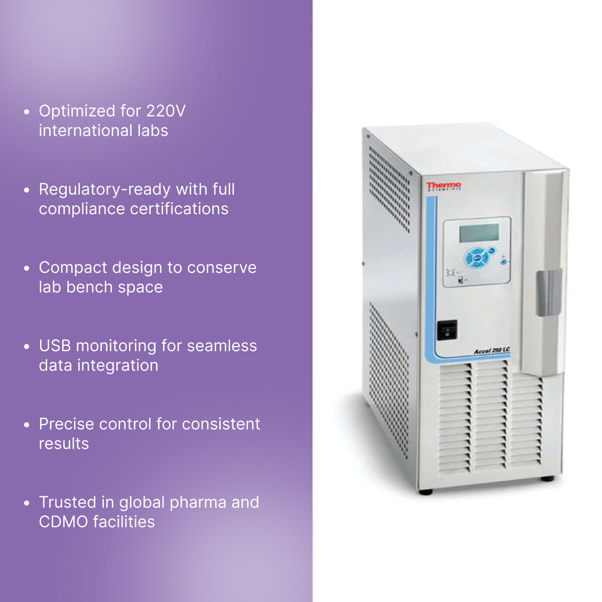 The Thermo Scientific Polar Series Accel 250 LC Recirculating Chiller (220V/60Hz) delivers 250 watts of dependable thermal control across a broad working range of –10°C to +80°C. Built for laboratories that operate on 220V power systems, this model is a strong fit for global CDMO companies, biotech facilities, and Patheon pharmaceuticals locations.