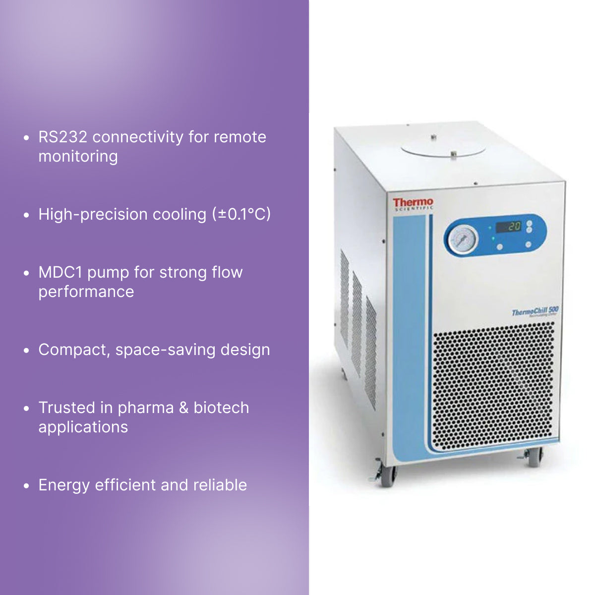 This version includes RS232 communication, making it easy to integrate with laboratory systems for remote monitoring and automated control. Compact yet powerful, the ThermoChill I MDCI RS232 is designed to support critical workflows in labs, manufacturing, and biopharma environments.