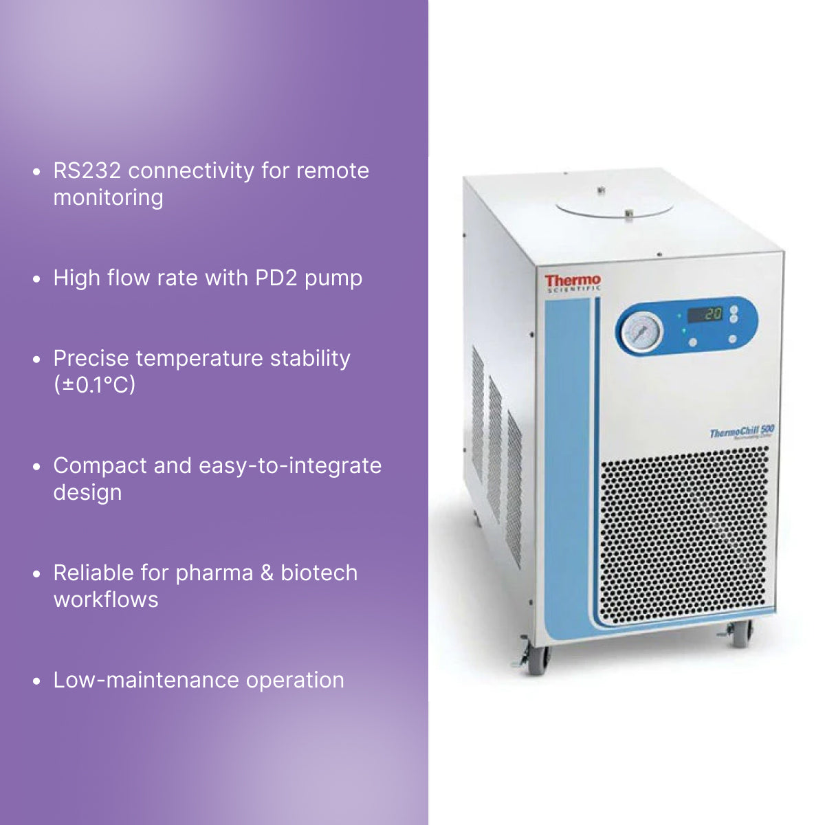Trusted by research institutions, manufacturing environments, and pharma services companies, ThermoChill II PD2 RS232 is backed by Thermo Fisher Scientific Inc—a global leader supporting CDMO pharma companies like Patheon pharmaceuticals in regulated drug development and biopharma production.