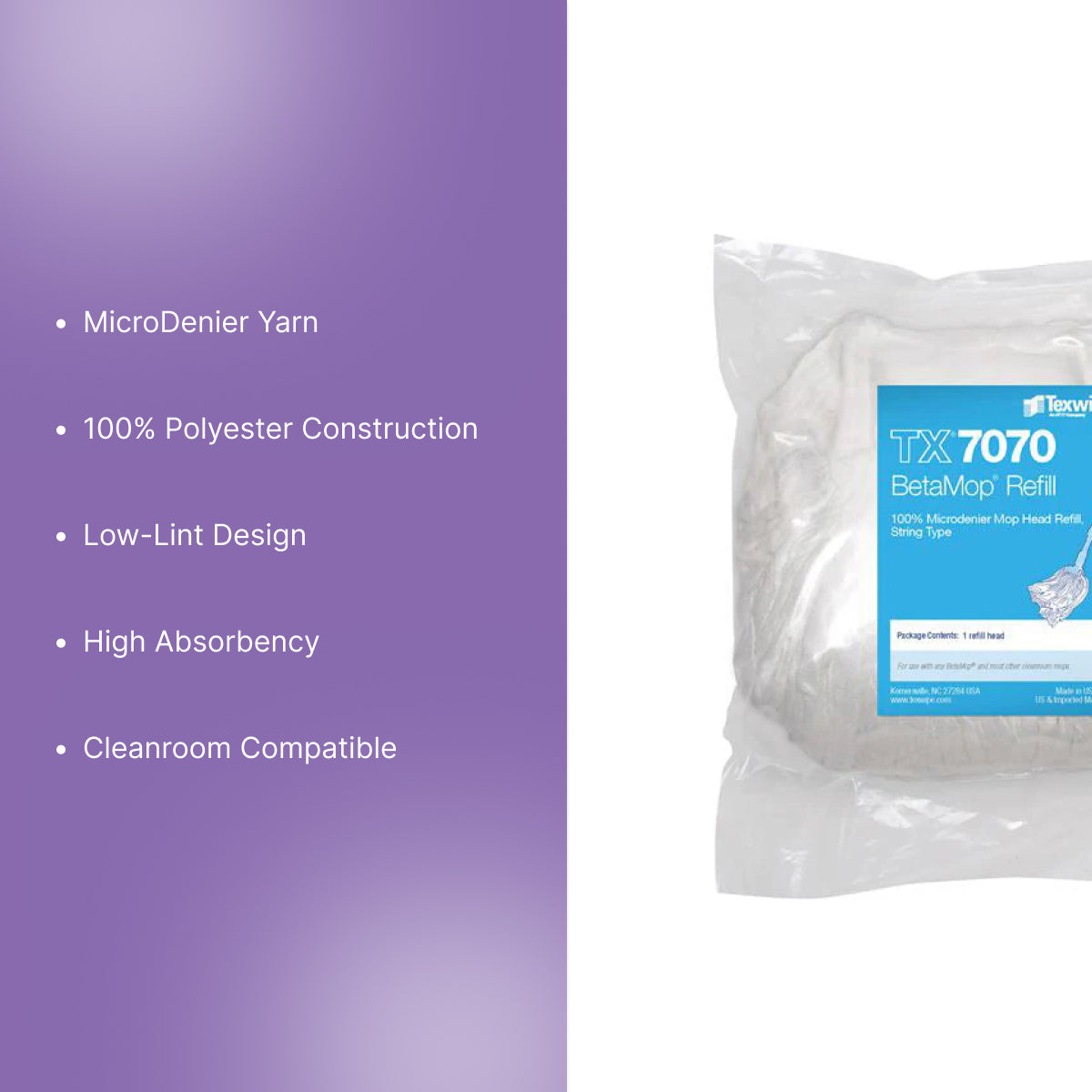 The Texwipe BetaMop MicroDenier 100% Polyester String Mop Refill Heads (TX7070) are designed for contamination control in critical cleanroom environments. These mop heads are made from ultra-fine microdenier polyester yarns that provide excellent absorbency and consistent cleaning performance with minimal lint generation.