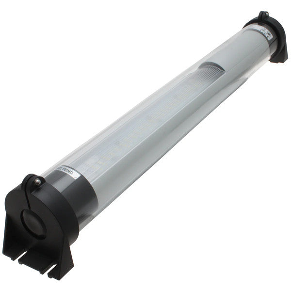 Tubular LED Machine light 22.72 inches in length (577mm). Sealed to keep out fluids, chips and shavings. Ideal for machining centers, workshops, semiconductor manufacturing equipment, clean rooms, workstations etc. Has glass diffuser lens that provides even light distribution. Comes with mounting fixture and hardware and a 6 ft cable with a 110V plug