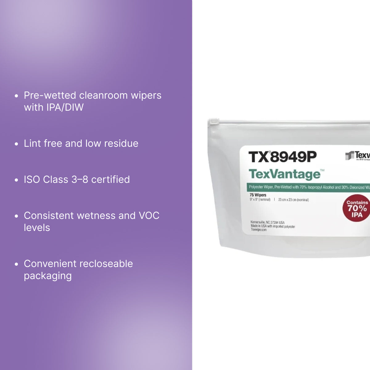 The TexVantage TX8949P Wipers are pre-wetted cleanroom wipes designed for convenience and consistent performance. Pre-saturated with 0.2 μm filtered 70% USP-grade isopropyl alcohol (IPA) and 30% deionized water, these wipes deliver optimized cleaning with repeatable wetness and VOC levels. Made from 100% polyester with a sealed-edge design, they maintain low lint and durability across a wide range of cleanroom applications.