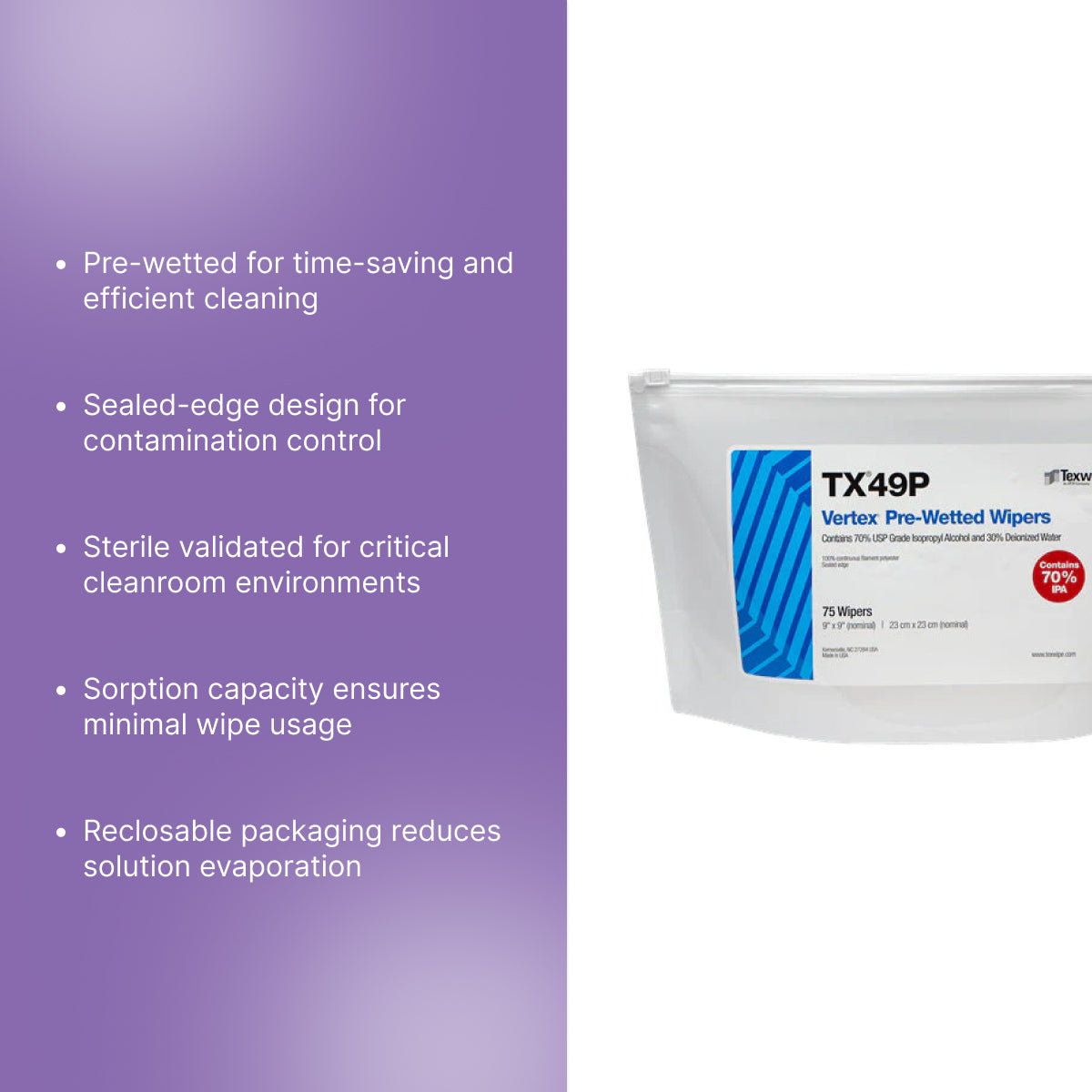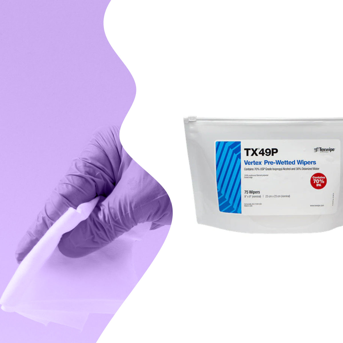 Texwipe VERTEX TX49P is a high-performance pre-wetted cleanroom wipe designed to meet the needs of the most demanding cleanroom environments. Manufactured using Texwipe’s advanced Vertex® Process, the TX49P wipes feature High Sorption Capacity, allowing them to absorb more solution and reduce the number of wipes needed for efficient spill control.