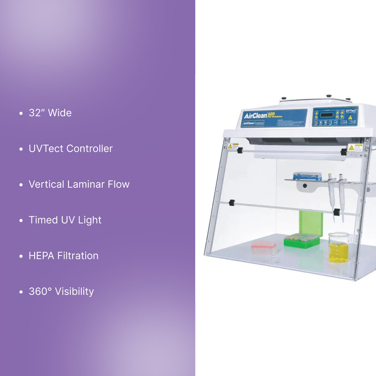 This 32″ wide Combination PCR Workstation provides a controlled Class 100 (ISO 5) vertical laminar flow air environment to help prevent sample contamination during PCR setup. The integrated UVTect microprocessor controller manages timed UV light sterilization and system functions.Designed for clear visibility and contamination control, the unit features a clear polycarbonate shell for 360° viewing and a seamless plastic design with no joints or gaps. The workstation includes a digital UV light timer, lab event timer, and a built-in HEPA filtration system.