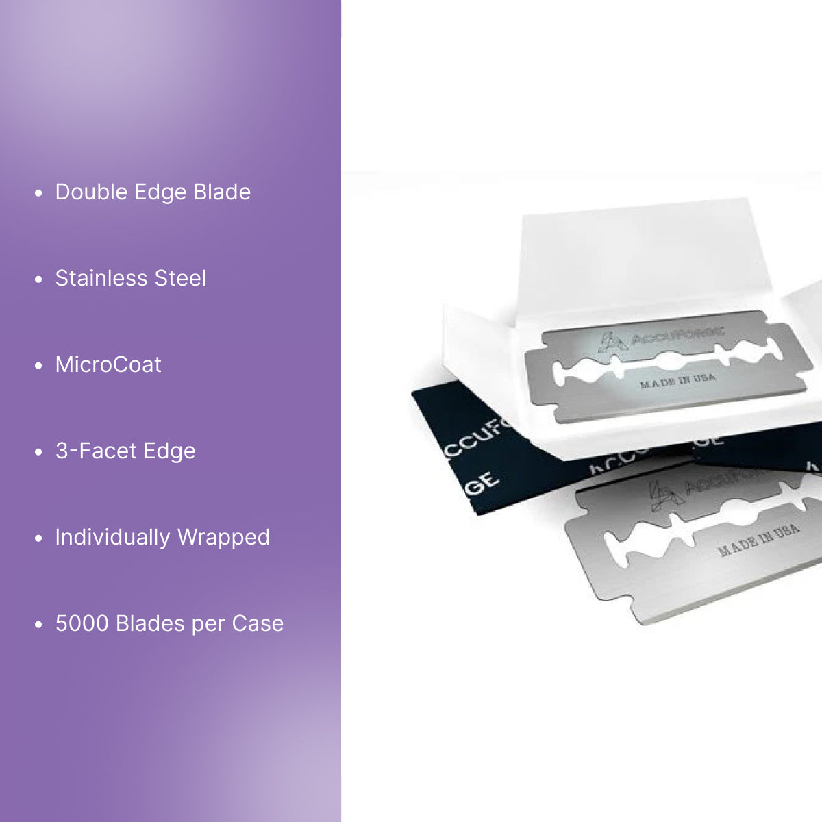 AccuForge Stainless Steel Double Edge Blades feature MicroCoat technology and a 3-facet cutting edge. These blades are manufactured at .004" thickness and are individually wrapped in oil.Each case contains 5000 blades, packaged as 250 blades per carton with 20 cartons per case. Designed for sharpness and durability, the blades incorporate MicroCoat enrichment and stainless steel construction.