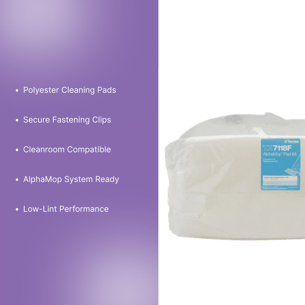 The Texwipe AlphaMop Polyester Pad Replacement Kit is designed for effective contamination control in cleanroom environments. This replacement kit includes polyester mop pads and fastening clips for secure attachment to AlphaMop cleaning systems. The polyester pads are engineered for high absorbency, low particle generation, and compatibility with disinfectants commonly used in cleanrooms.