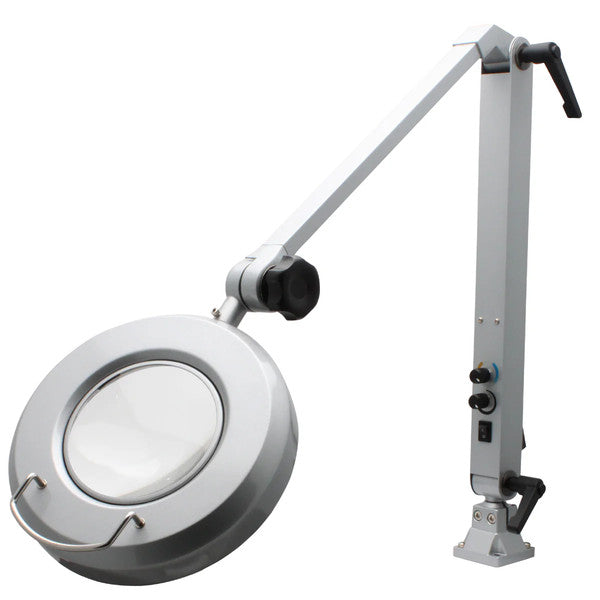 LED magnifying lamp with a 5" round glass lens (2.25x magnification). Durable aluminum construction. Features tension locks at the joints of the lamp to secure the lamp in place in any position. Features 36 adjustable white LEDs and 36 adjustable amber LEDs.  Color temperature range: 3500K-6500K.  Includes a metal mounting clamp, as well as a set of 4 screws for mounting the lamp directly to a tabletop.