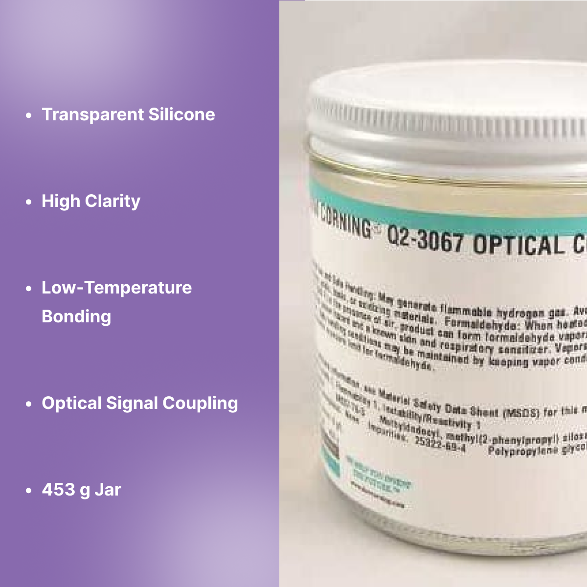 DOWSIL™ Q2-3067 Optical Couplant is a transparent, grease-like silicone compound used to improve the sensitivity of optical devices and prevent loss of intensity during light transmission. It provides high clarity, good mechanical shear stability, and the ability to bond at low temperatures. The product is supplied in a 453 g jar.