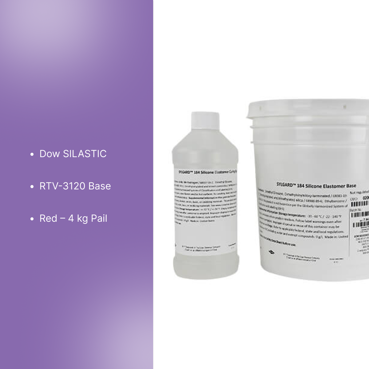 Dow SILASTIC RTV-3120 Base Red is a silicone rubber base supplied in a 4 kg pail. It is designed for room-temperature vulcanizing applications and serves as the base component for producing flexible RTV silicone rubber. The material is intended for mold-making, potting, and encapsulating applications, offering ease of mixing and pouring and reliable cured rubber performance.