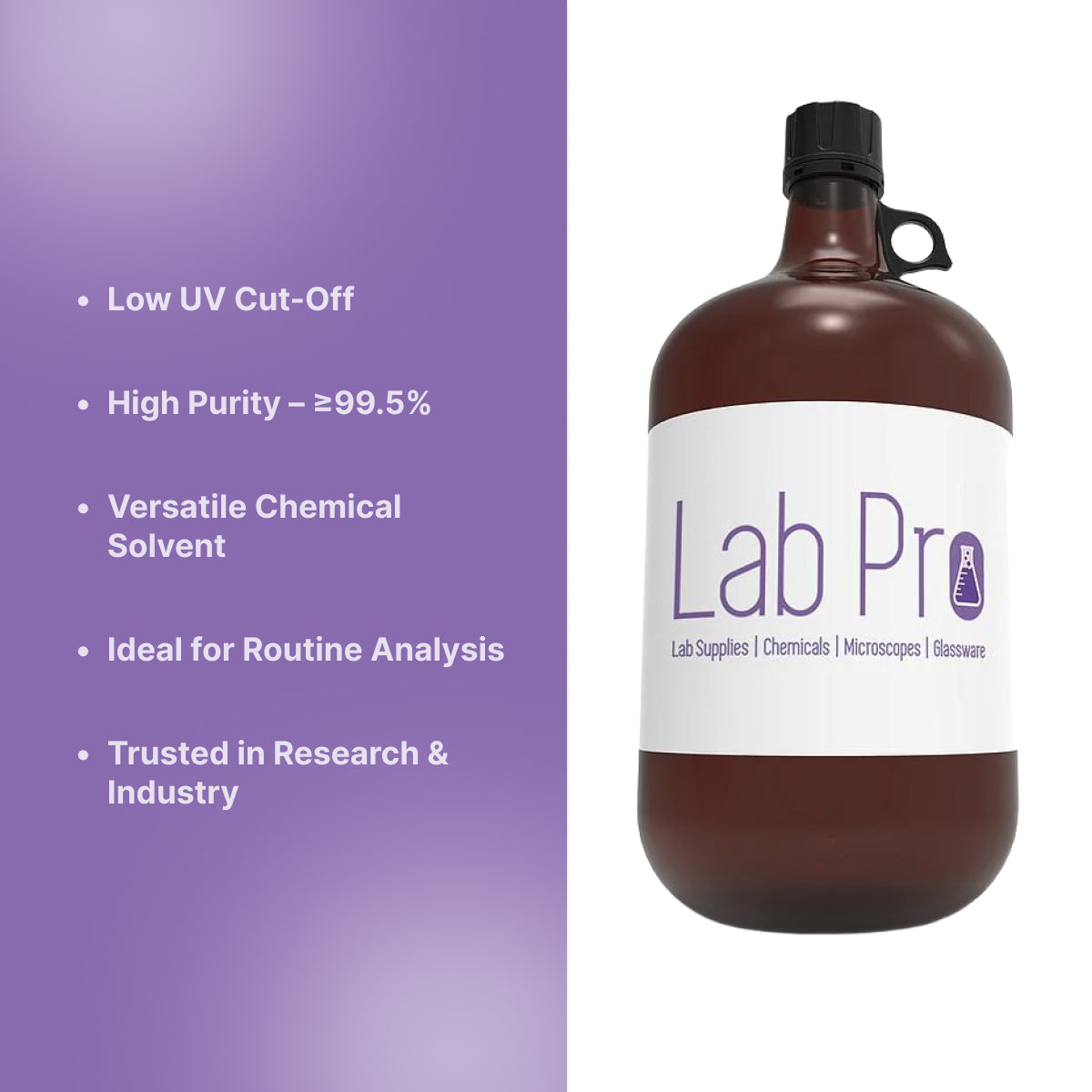 Methanol HPLC Grade is a high-purity solvent designed for routine High Performance Liquid Chromatography (HPLC) applications. Packaged in a four-liter amber glass bottle within a protective fiber box, it provides consistent performance with low residue after evaporation, low UV cut-offs, and stable baselines.