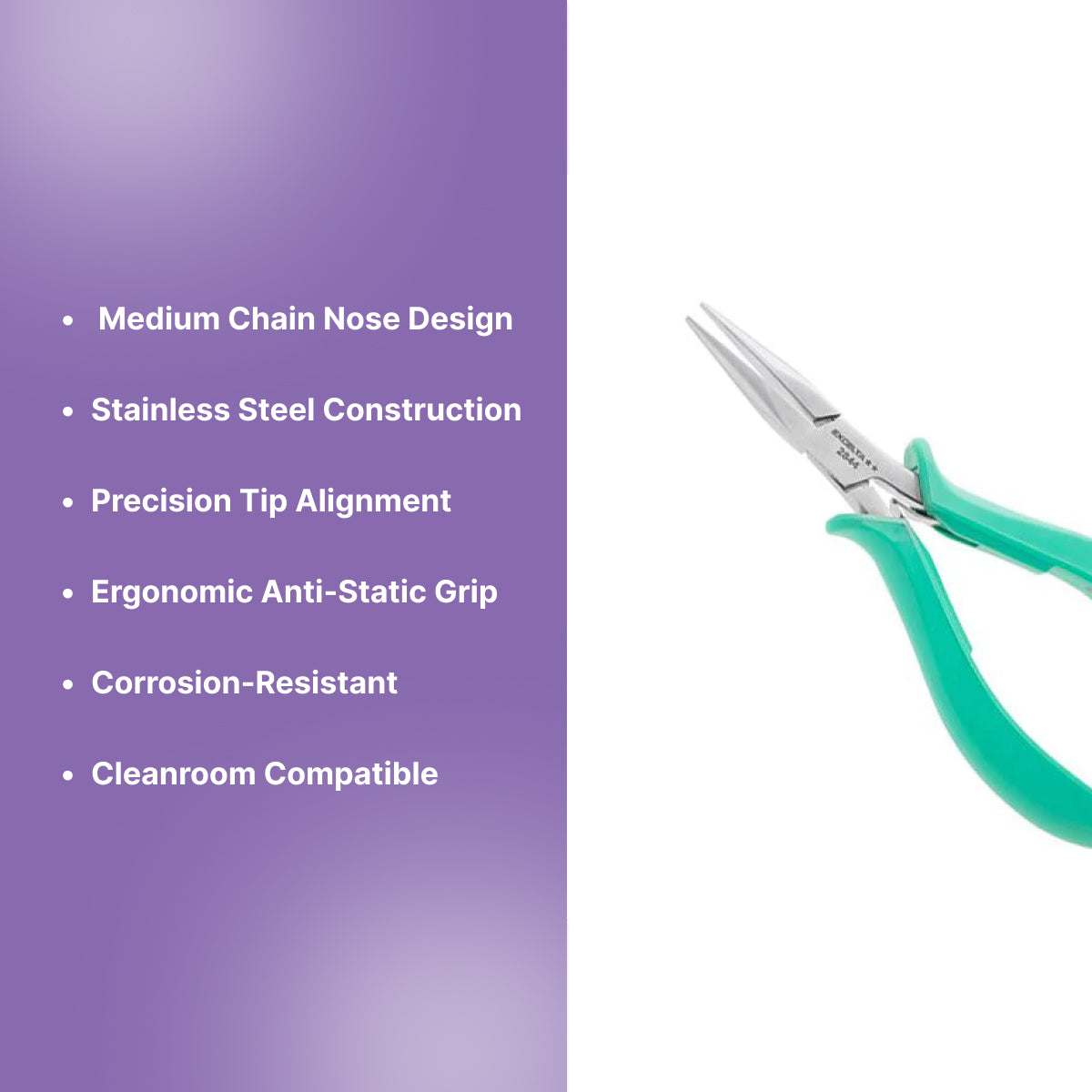 The Excelta Medium Chain Nose Stainless Steel Pliers deliver precision handling, durability, and control for technicians, engineers, and laboratory professionals. Crafted from high-grade stainless steel (AISI 440), these pliers are built to resist corrosion and provide reliable performance in demanding cleanroom, electronics, and assembly environments.